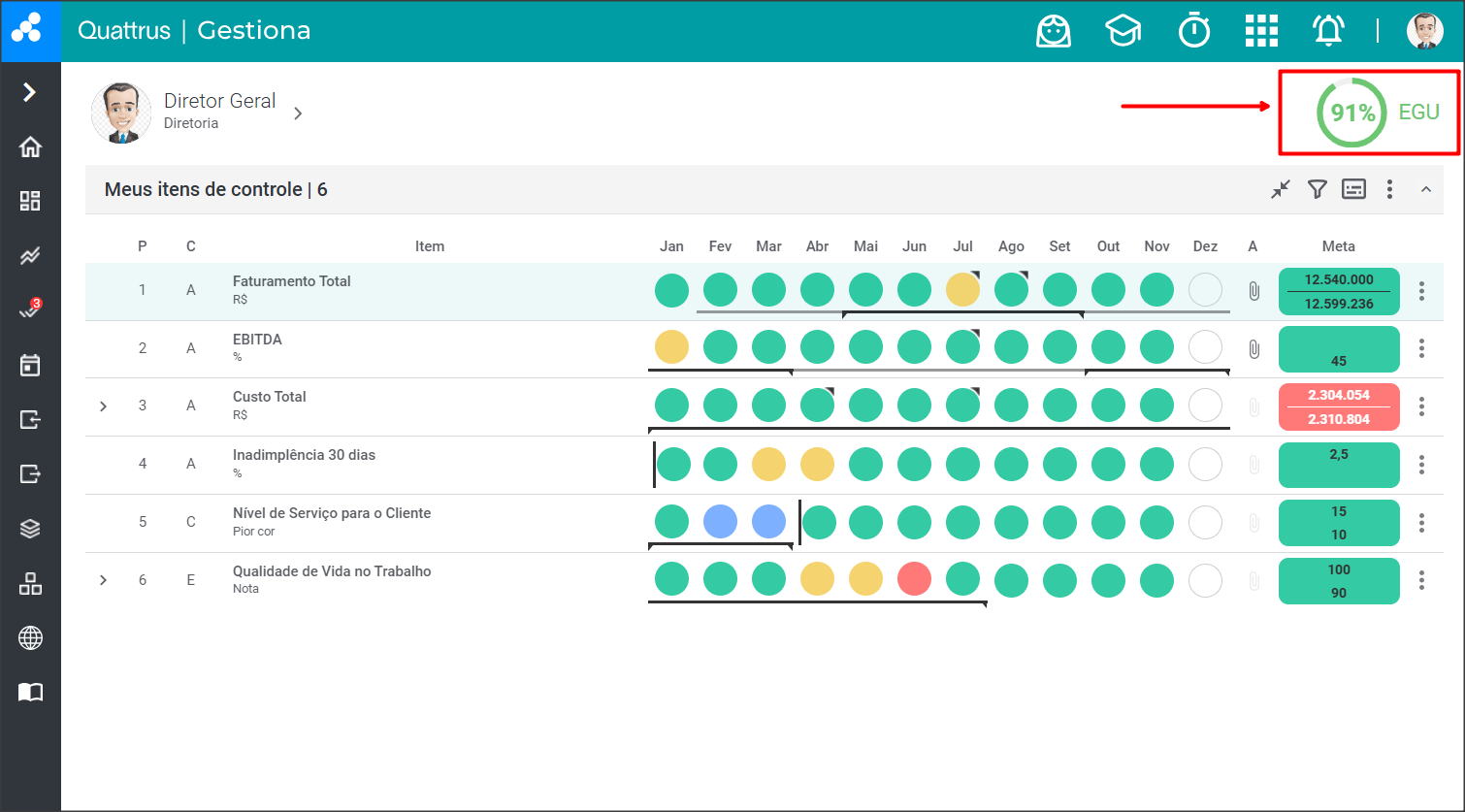 Na seção Nota Geral, você verá uma tabela com os usuários subordinados e suas respectivas notas de EGU, sendo que o sistema considera: vermelho as notas inferiores a 50%, amarelo para 51% a 69% e verde as notas superiores a 70%.