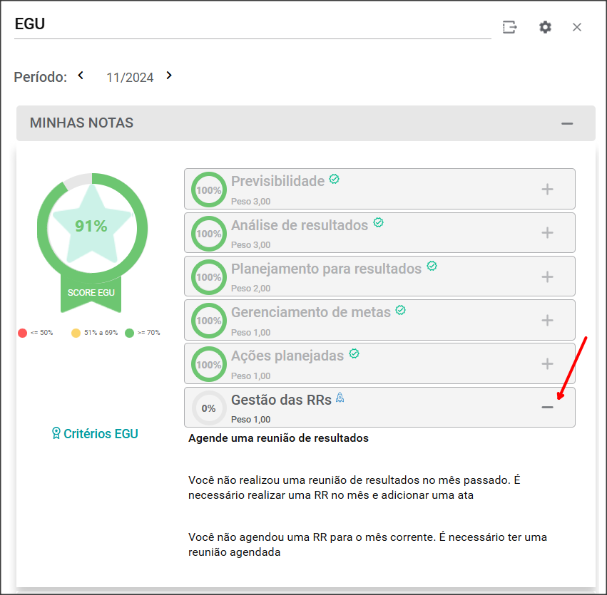 Por exemplo, no critério Gestão das Reuniões, ao clicar no ícone de “+” você poderá consultar os detalhes das pendências. Neste caso está pedindo para Agendar uma reunião de resultados.
