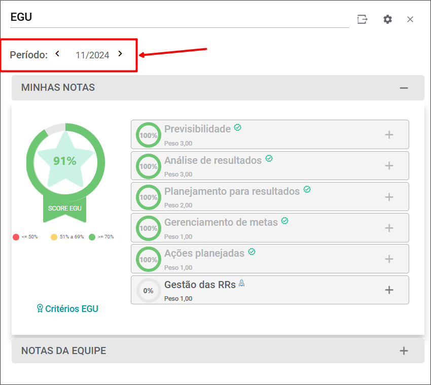 Nesta tela está disponivél uma função “Periodo” para consultar a pontuação da EGU de outros meses, basta clicar no botão para ir meses atras ou meses para frente.