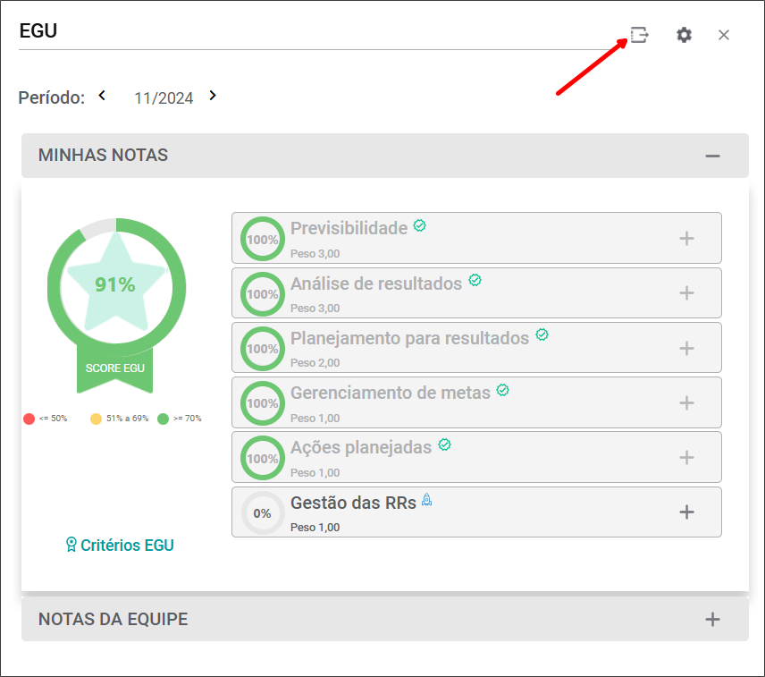 Você pode acompanhar sua nota de EGU em tempo real no ícone Score EGU, que aparece no canto direito do seu dashboard.