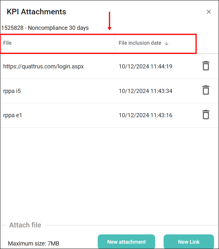 In the Item Attachment screen, you can also view the file or link name in the File column and the date it was added in the File Inclusion Date column: