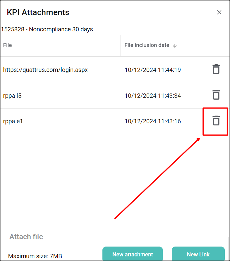 To delete a file, simply select the file and click the trash can icon at the end of the row where the attachment information is displayed to delete it: