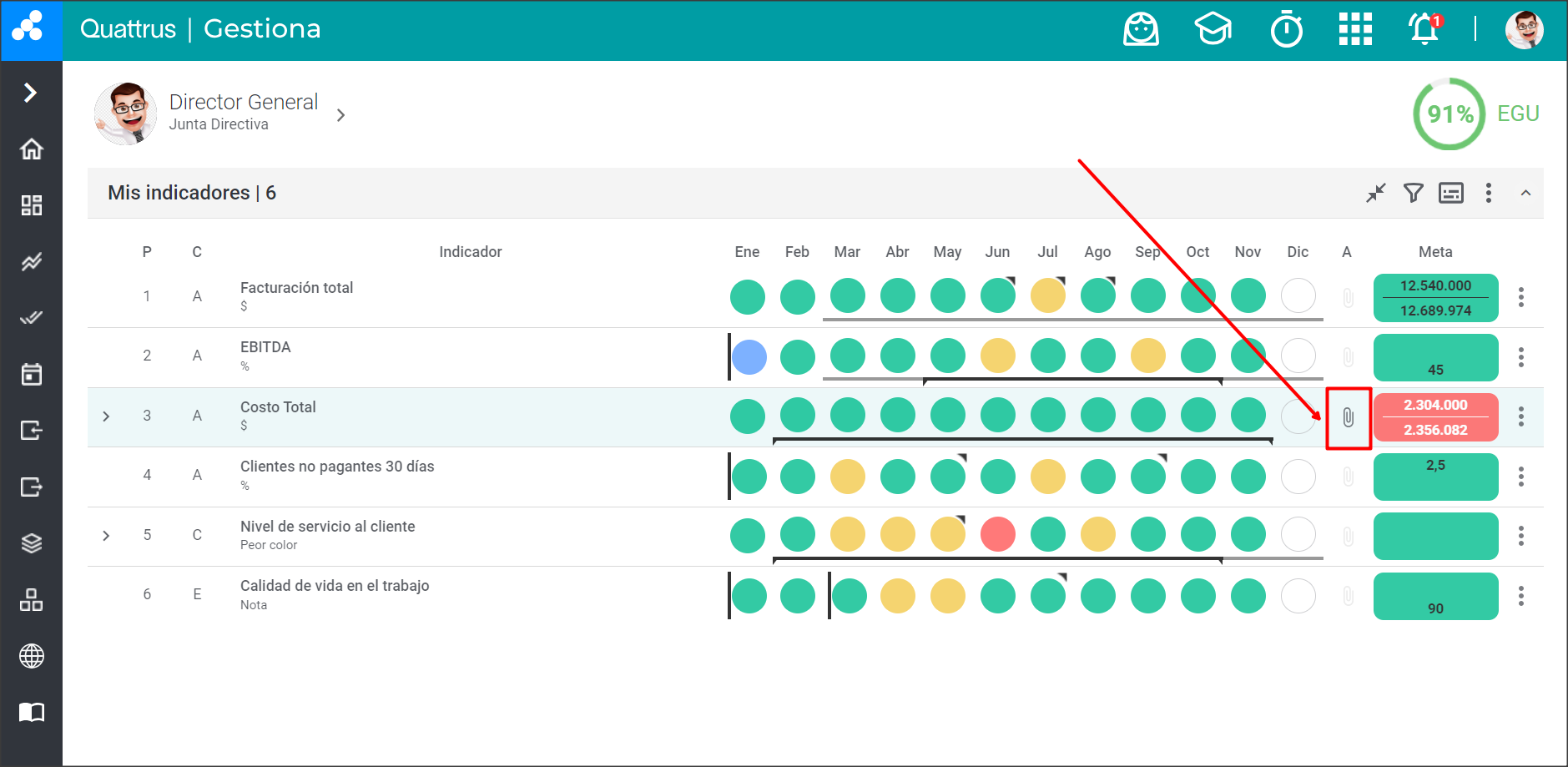 Selecciona el indicador al que deseas agregar un archivo adjunto y haz doble clic en el ícono del clip para ingresar a la pantalla de Adjuntos del Indicador, como se indica en la imagen: