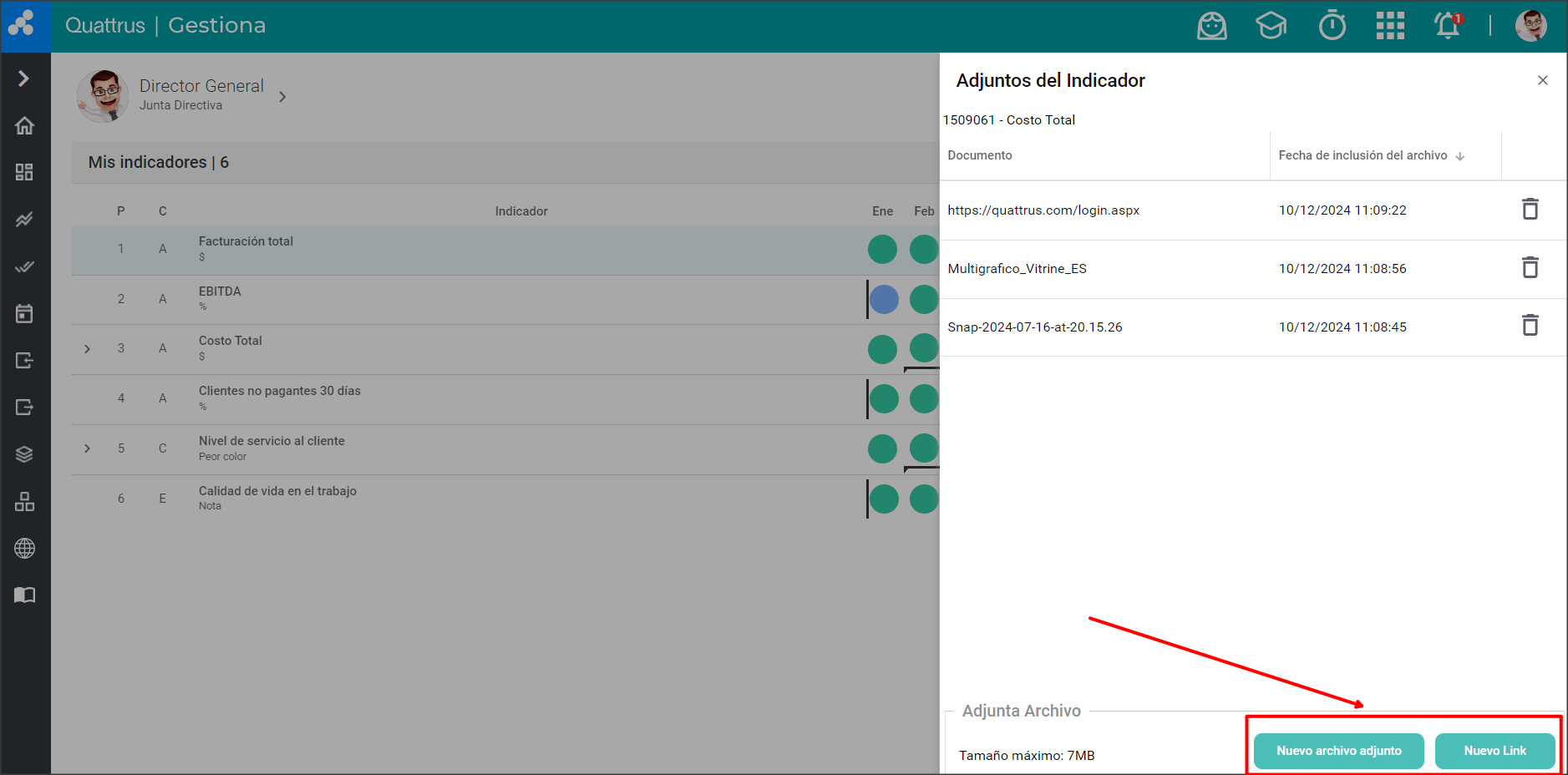 Puedes adjuntar archivos a tus indicadores, facilitando el acceso a informes o presentaciones, por ejemplo.
