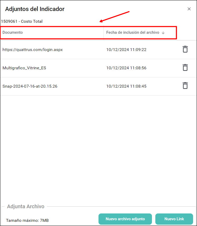 En la pantalla de Adjunto del Elemento también puedes ver el nombre del archivo o enlace en la columna Documento y la fecha en que se agregó en la columna Fecha de inclusión del archivo: