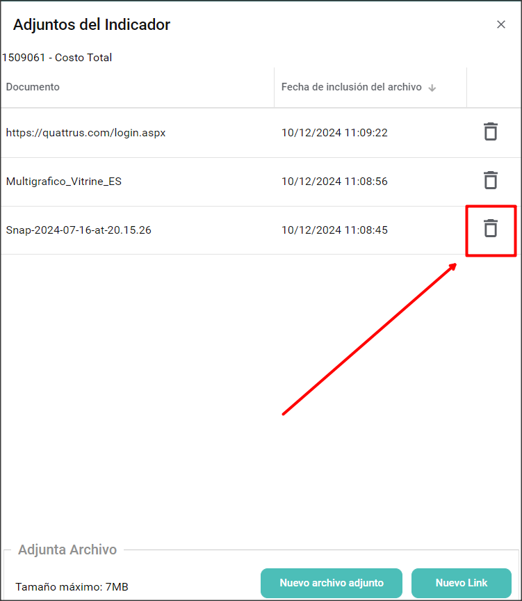 Para eliminar un archivo, solo selecciona el archivo y haz clic en el ícono de la papelera ubicado al final de la fila donde está la información del adjunto para eliminarlo: