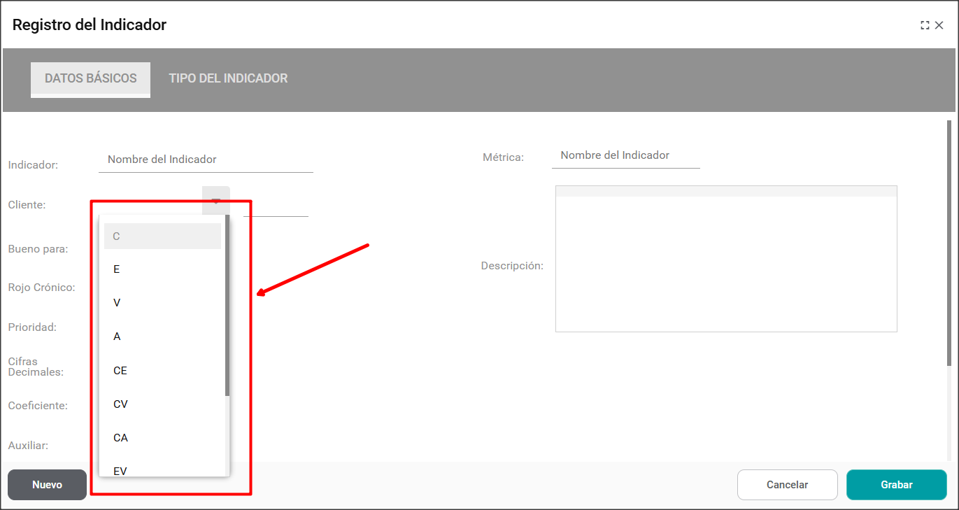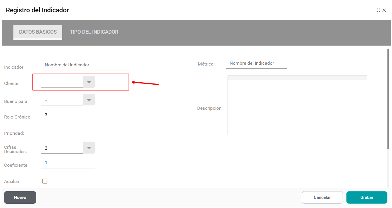 En el tablero puede registrar el tipo de cliente haciendo clic en el icono de los tres puntos, después en Añadir indicador para abrir la pestaña de registro del Indicador.
