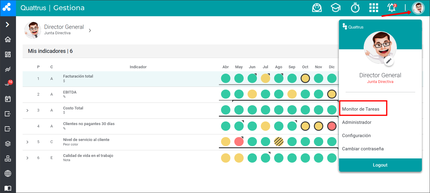 Si no tiene esta función habilitada, comuníquese con su Administrador, Facilitador o Consultor para solicitarla. Si su empresa no tiene Monitor de tareas, comuníquese con el soporte de Quattrus.