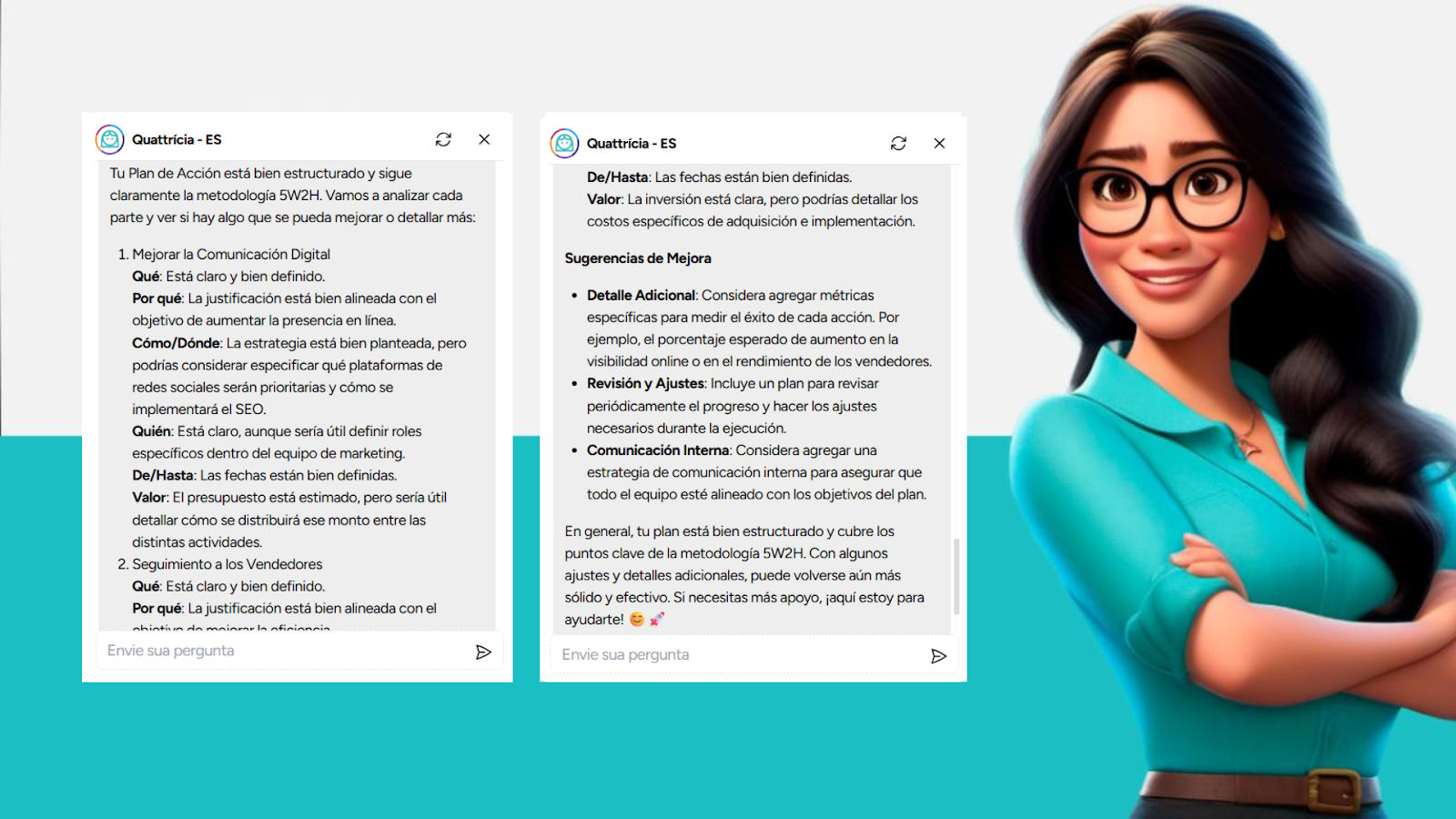 Con el apoyo de Quattrícia, nuestra asistente inteligente integrada al sistema, ahora es más fácil evaluar la solidez de cada plan antes de ejecutarlo. Ella analiza las acciones propuestas, identifica puntos débiles, detecta inconsistencias y te alerta si algo está vago, mal alineado o mal estructurado.