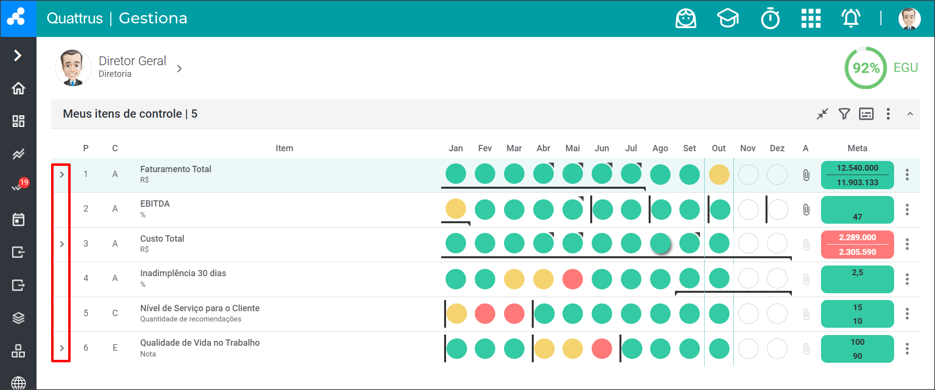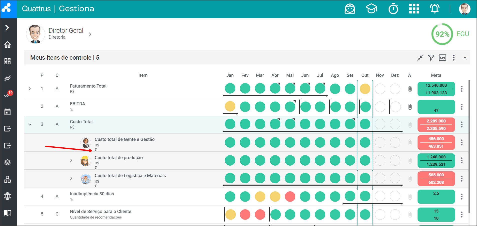 Quando um indicador tem uma “seta” ou “flecha” na primeira coluna, ele pode ser um item de controle Totalizado ou Vinculado. Para saber, clique na seta e veja os itens abaixo do Item de Controle.