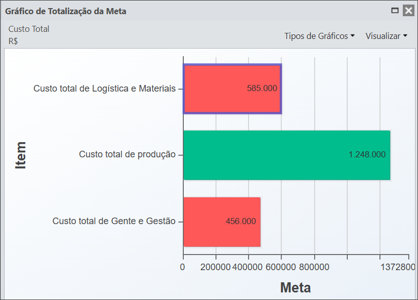 Se seu Item de controle está Totalizado, você poderá abrir o gráfico de totalização de metas e identificar quantos e quais Itens estão influenciando os seus resultados.