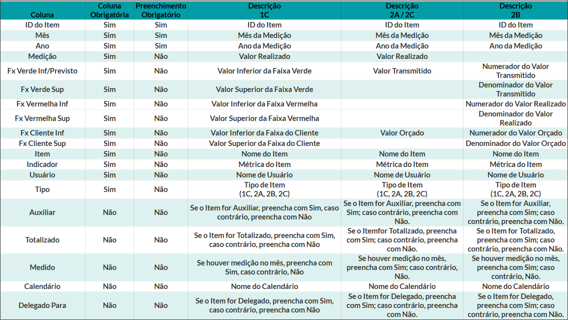 • Quando as colunas de medição e faixas estiverem em branco, será considerado o valor constante no Gestiona, de forma que, se não houver alteração de valores, não há necessidade de preenchimento.