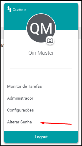 Após realizar o seu login, você poderá alterar sua senha a qualquer momento. Para isto, clique no seu avatar de perfil e na opção Alterar Senha, conforme mostrado abaixo: