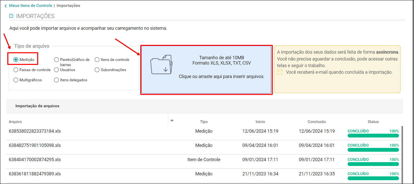 Você pode clicar no botão “Atualizar” para ver o status de envio do arquivo. Quando estiver pronto, no status aparecerá a mensagem: (100%) Importação efetuada com sucesso.