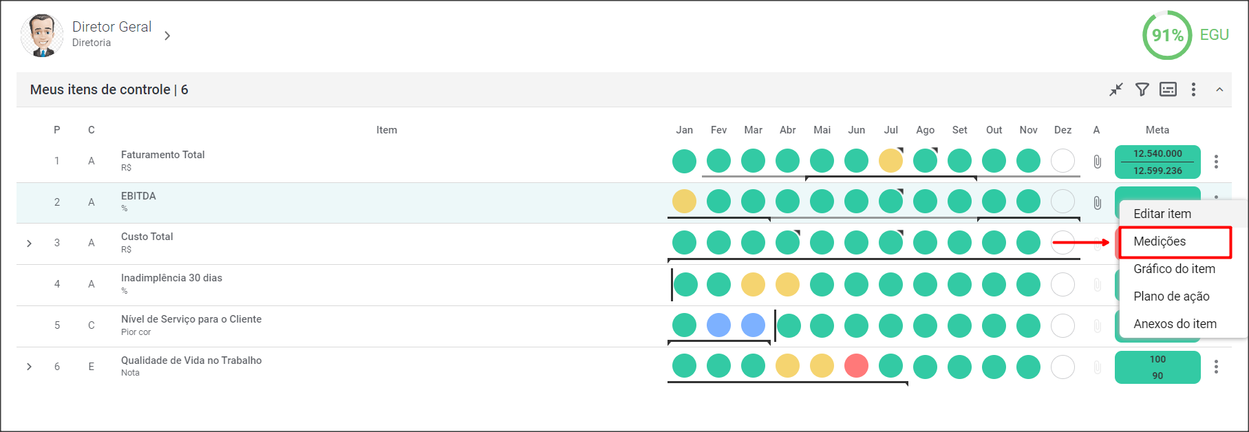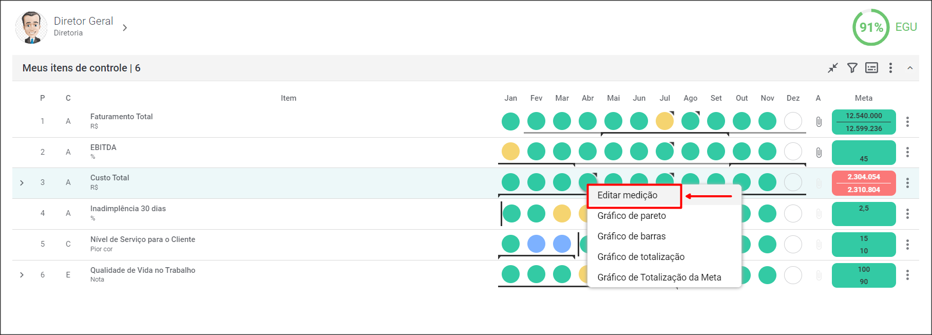 Você também poderá inserir valores diretamente no Dashboard. Para isso, basta clicar no farol do mês desejado e escolher a opção Editar Medição.